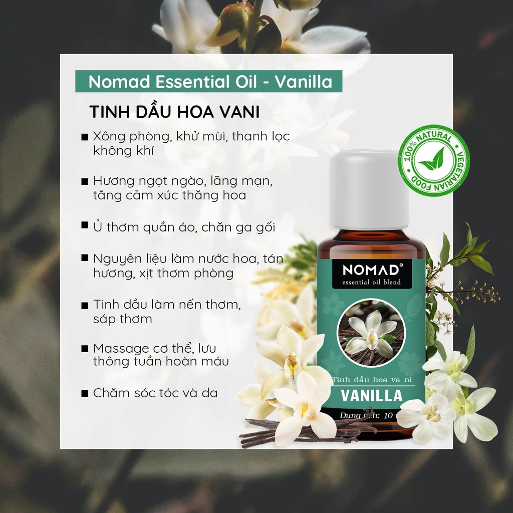 - 100% Tự Nhiên & An Toàn: Tinh dầu vani Nomad được chiết xuất từ quả vani tự nhiên, không chứa hóa chất, an toàn cho người sử dụng.