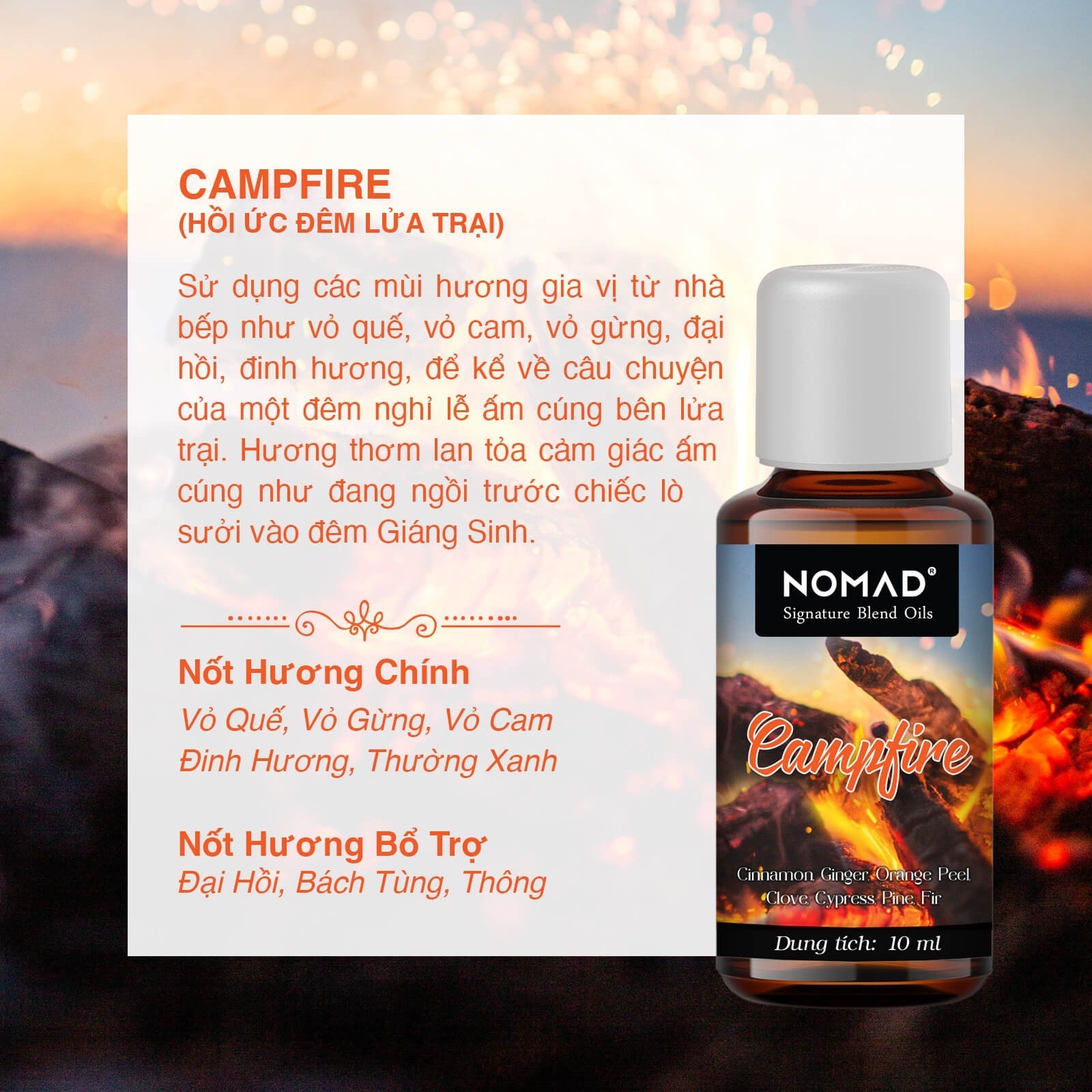 Tinh Dầu Nomad Signature Blend Oils - Campfire là sự kết hợp mạnh mẽ giữa hương gỗ cháy, xạ hương và khói, mang đến một mùi hương ấm áp, quyến rũ và đầy cảm giác mạo hiểm. Hương thơm của lửa trại tạo ra một không gian sống ấm cúng, thư giãn, như đang ngồi bên đống lửa giữa thiên nhiên hoang dã. Campfire là lựa chọn lý tưởng cho những ai yêu thích sự mạnh mẽ, tĩnh lặng và muốn tìm kiếm một trải nghiệm hương thơm đầy cảm xúc, gợi nhớ những kỷ niệm ấm áp và tự do trong những buổi tối quây quần bên lửa trại.